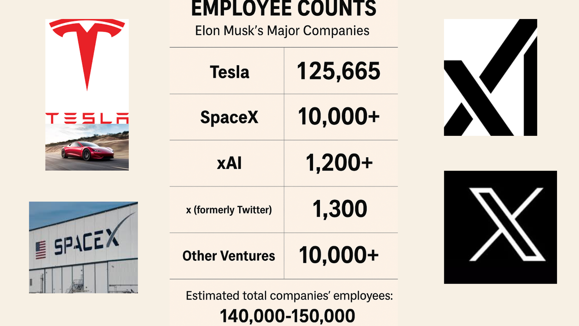 Other ventures are estimated to be in the hundreds. Overall, Estimated companies employ approximately 140,000 -150,000 people globally in 2025. This includes Tesla, SpaceX, xAI, and x, with perhaps some contribution from his other ventures.